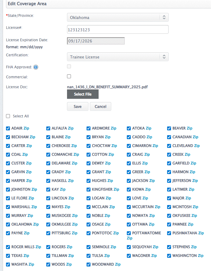 - Update coverage area for each state you are licensed in by selecting the edit icon under the “Action” column